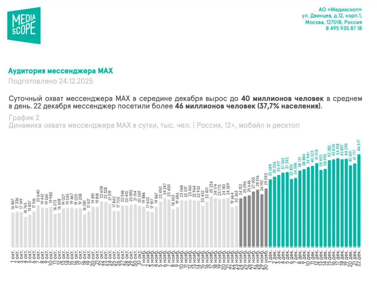 Статистика Mediascope говорит сама за себя: ежедневная аудитория MAX — 46,4 миллиона человек. Это треть населения страны! Мы уже внесли свою «копеечку» в общие 6,5 миллиардов сообщений мессенджера — создали там наш канал. Подпишитесь? Вам не трудно, а нам приятно...