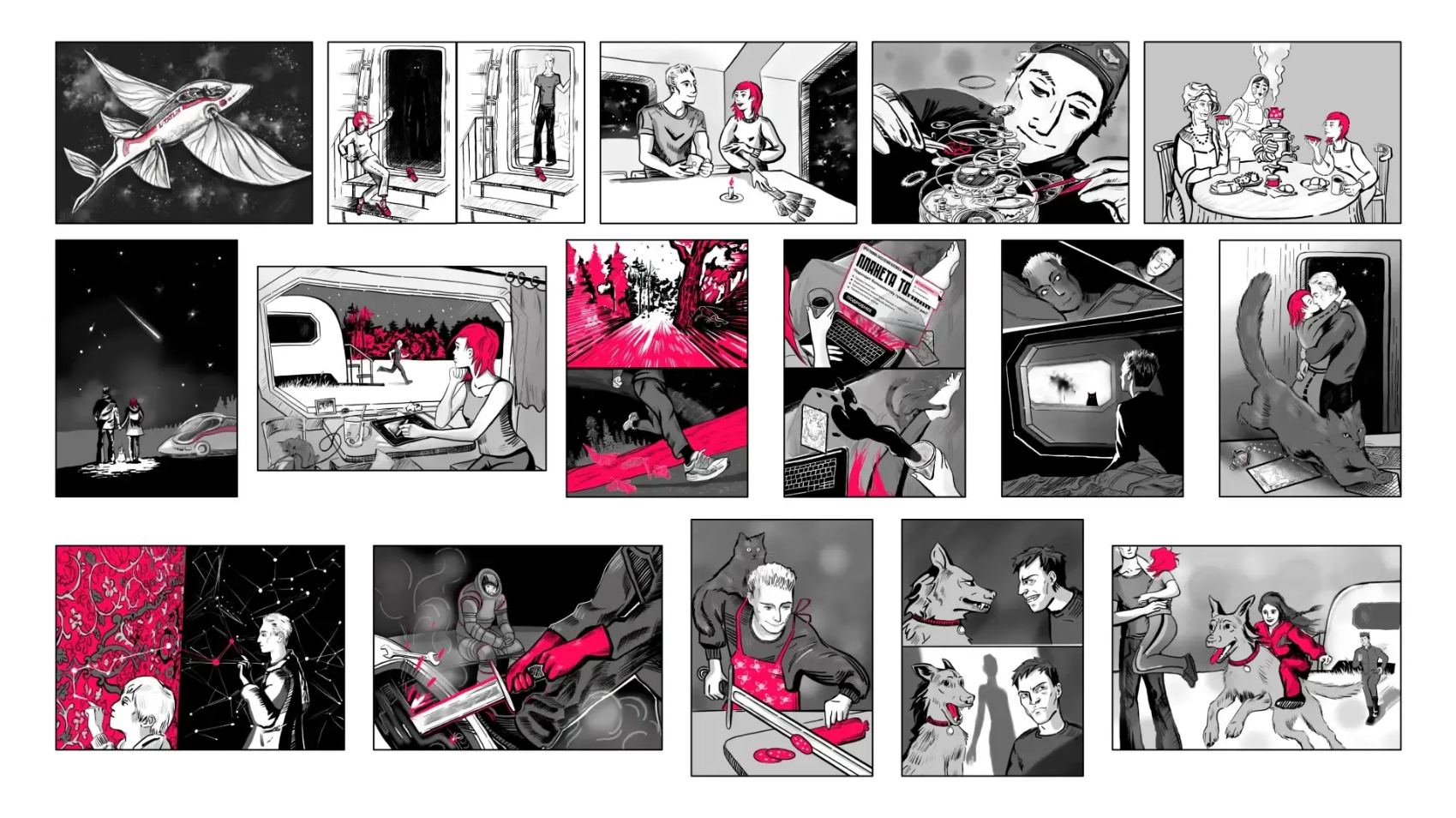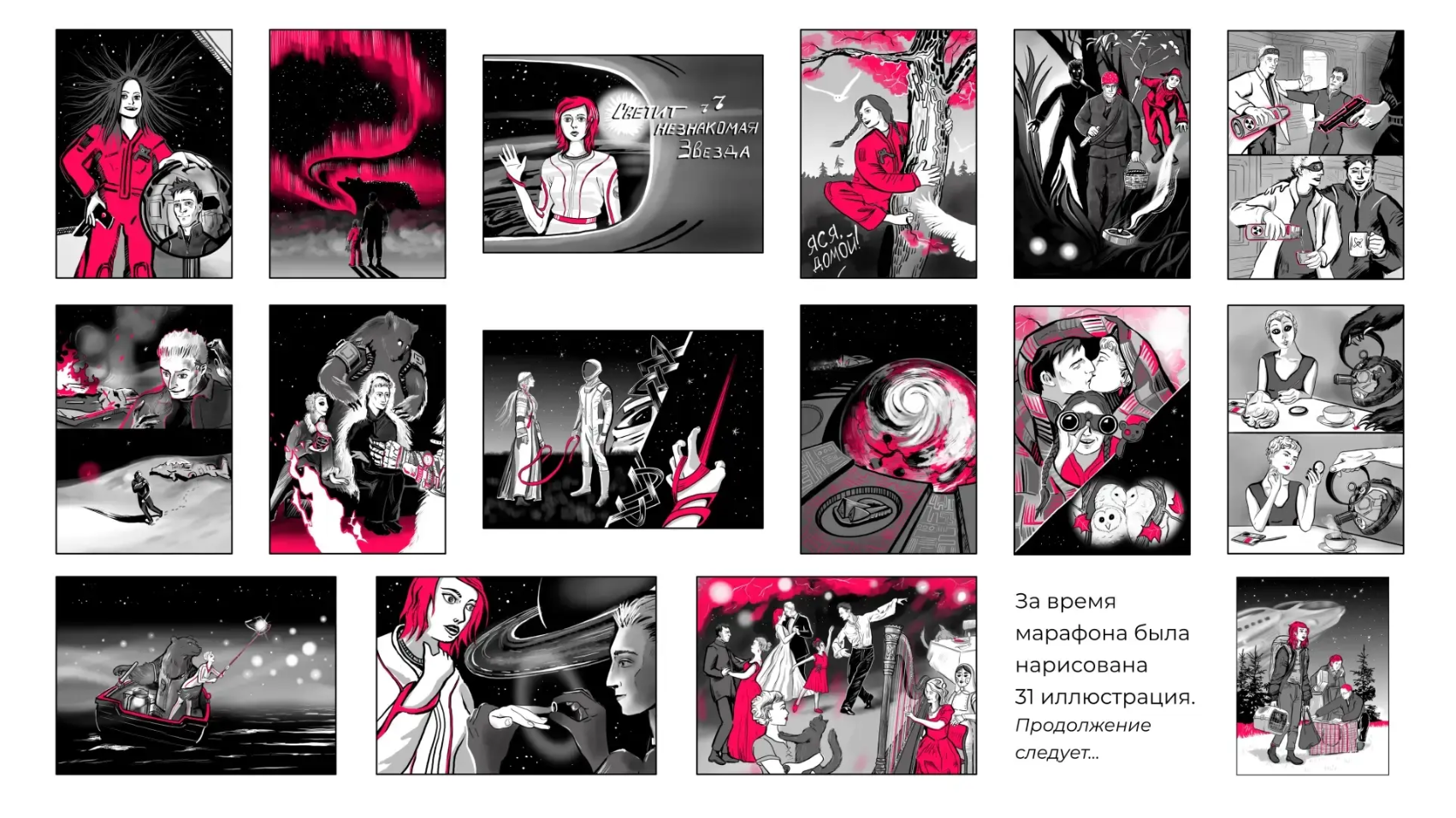 Её новая серия иллюстраций — это нестандартный визуальный мир, где строгая научная космическая фантастика органично переплетается с мотивами русских народных сказок.